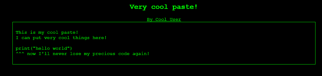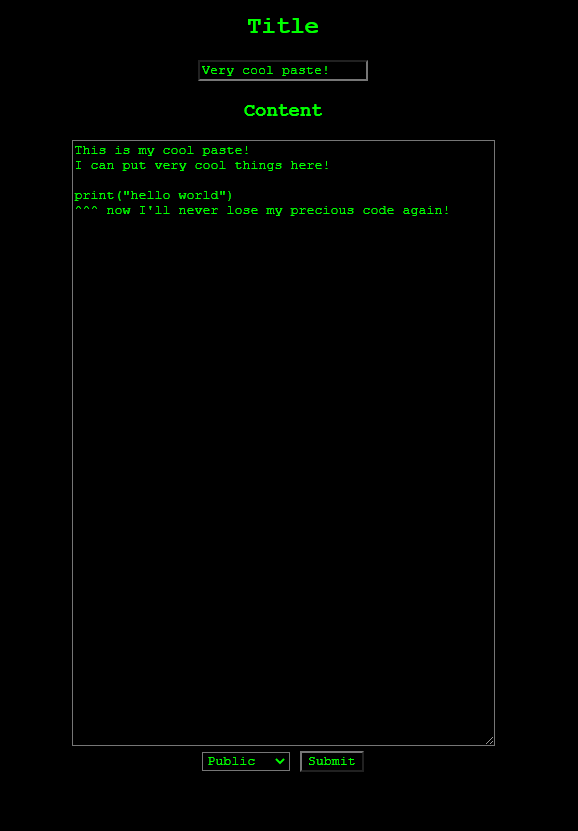 Darkpaste is a simple Pastebin alternative made for private use by me and my friends. It is not intended to be deployed for anything but small scale use.