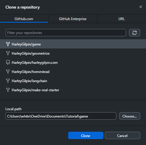 Now we'll want to clone the repository we just forked, click on "File" and then "Clone repository..."