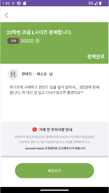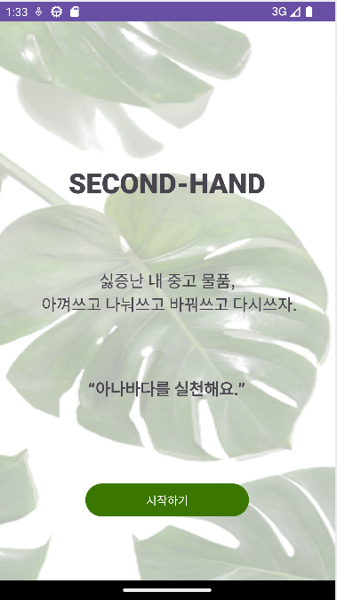 고급모바일프로그래밍, 중고마켓 SecondHand 싫증난 내 중고 물품, 아껴쓰고 나눠쓰고 바꿔쓰고 다시쓰자. "아나바다를 실천해요." 🛒 SecondHand 개발 기간: 2023.10 ~ 2023.12 2171317 강다현 2171170 김예원 2171335 양인서 2171431 오유진 🙋♂ Users (이메일/비밀번호) android@hansung.ac.kr / hansungandroid test@hansung.ac.kr / hansungtest 📱 Layout 첫 화면 회원가입 로그인 메인 화면 판매글 등록 상세 페이지 수정하기 채팅 보내기 채팅수신 목록