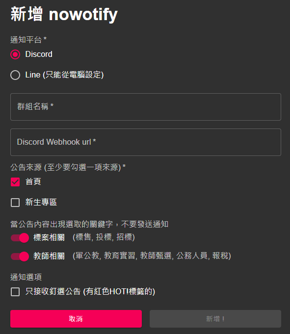 在發現公告內容有更新時,使用 discord webhook / line notify 將最新公告推送給用戶