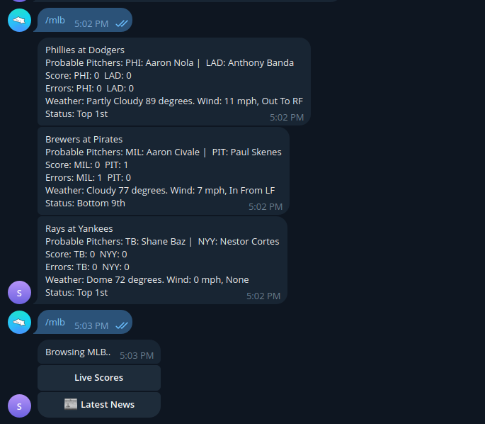MLB Baseball bot created using Nutgram. The contents of this haven't been updated properly since nutgram/laravel 1.0 but it still works on the current latest version nutgram/laravel 1.4. May add more and update soon. Nutgram is a joy to work with!
