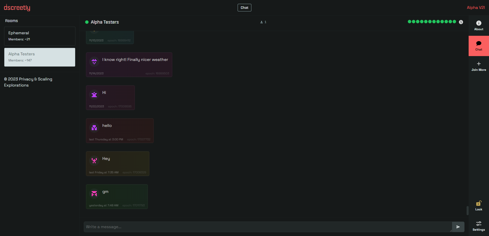 Discreetly is an anonymous and federated chat application. Under the hood it uses a zero-knowledge protocol called RLN (Rate-Limiting Nullifier) to rate limit messages per user. Read more about RLN.
