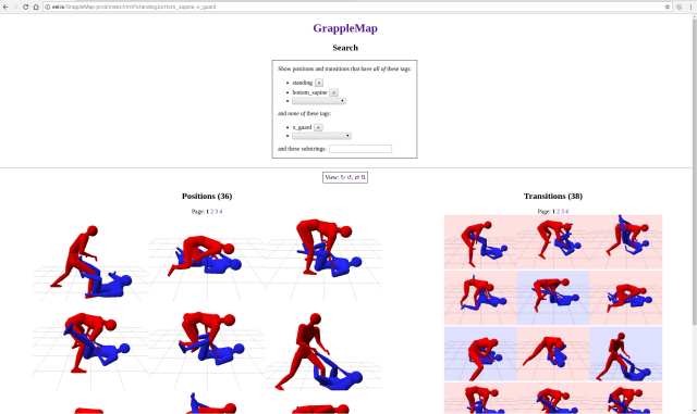 - A database of interconnected grappling positions and transitions, animated with stick figures.