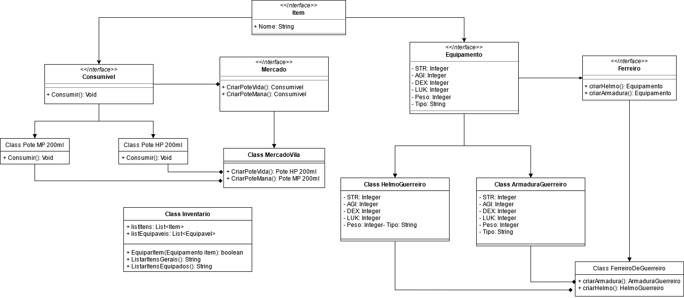 Vamos do início, a primeira coisa a se explicar aqui é a interface comum a todas as classes dos itens, que é a dita cuja Itens. Nela foi declarado apenas um atributo/método Nome. Em seguida vamos seguir pela linha da direita, agora temos uma nova interface chamada Equipamento que possui todos os atributos que um equipamento deve ter. Logo abaixo vemos 2 classes de uma mesma linha: HelmoGuerreiro e ArmaduraGuerreiro que herdam de Equipamento.