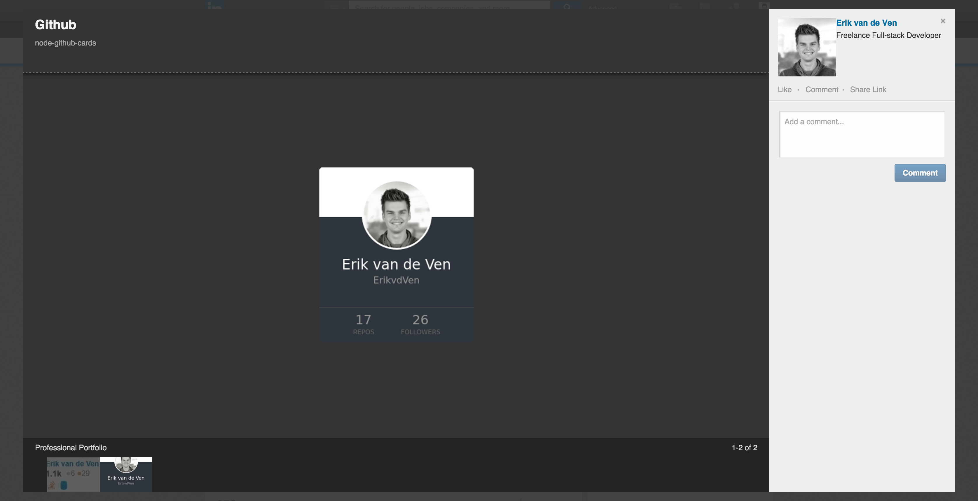 Since LinkedIn closed the GitHub app, I didn't really know how to share my GitHub information on LinkedIn. I loved Guille Paz's idea of creating cards with your GitHub information, but it's not an image so not really suitable for social networks like LinkedIn. So I combined the GitHub API and Guille's idea of creating cards in an app which generates an image, using node-webshot. The result is a "real-time" image, which contains recent information about your GitHub profile like Stackoverflow flairs. In this case my current amount of Followers and Repositories: