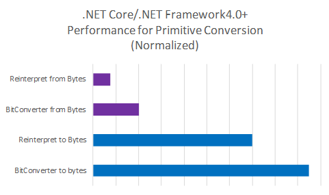 Performance differs between framework versions. BitConverter in older versions of .NETFramework is slower and in the .NET Core Corefx repo it's implemented in a significantly different way. All these effect the comparisions but Reinterpret.NET is usually still faster, especially the dangerous no allocation verion, with only BlockCopy being competitive due its unmanaged implementation. However for some unknown reason which doesn't appear to be IL related, could be GC or JIT, the performance of reinterpret suffers on the .NET3.5 and .NET2.0 platforms.