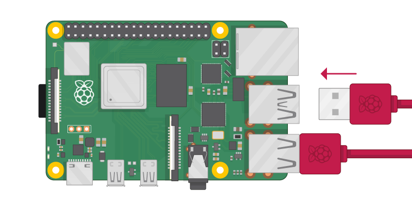 - It doesn't matter which port we choose; just locate the USB connection end of the mouse's cable and attach the mouse to the Raspberry Pi.
