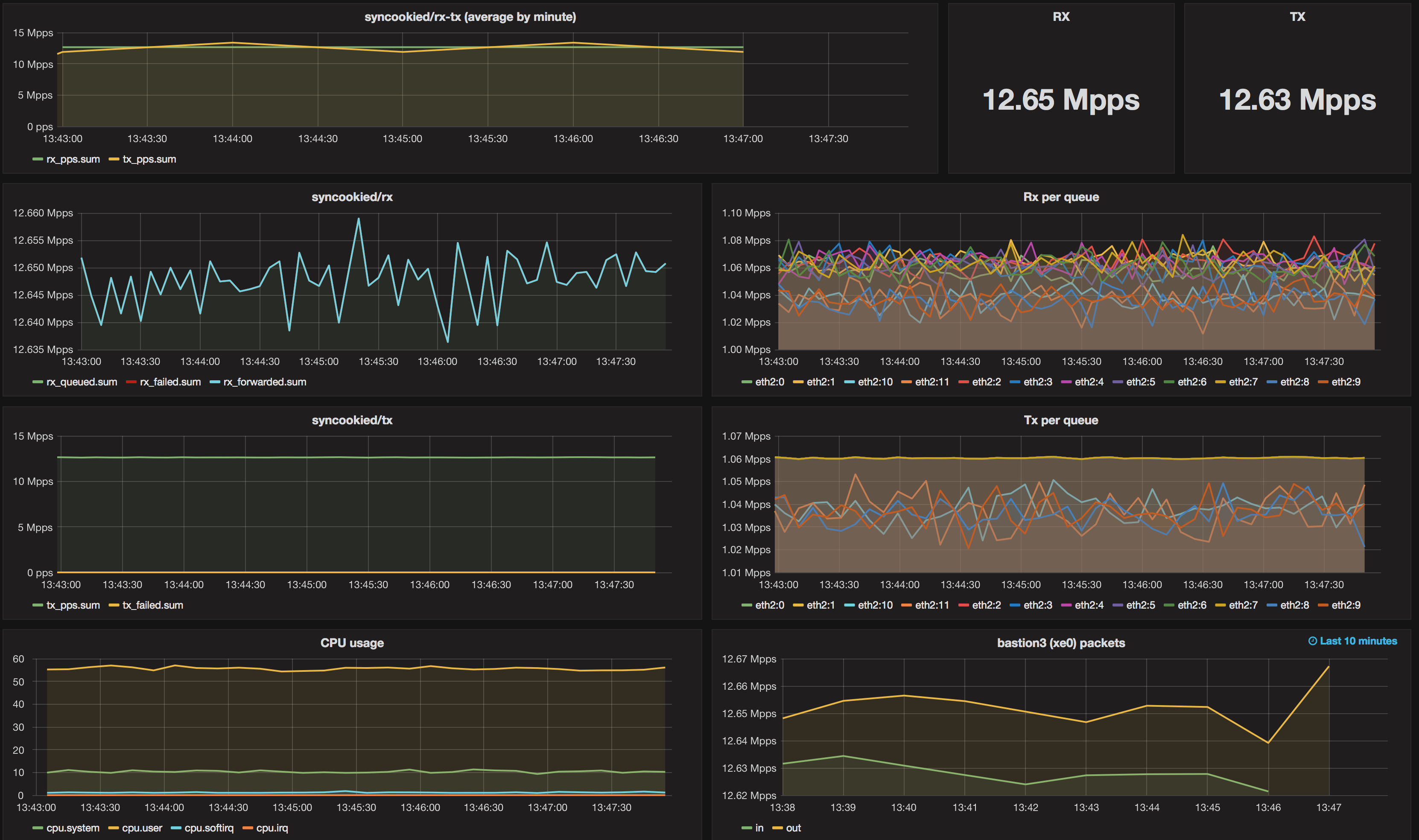 syncookied under 12.65 Mpps syn flood attack utilizing 12 cores of Xeon E5-2680v3:
