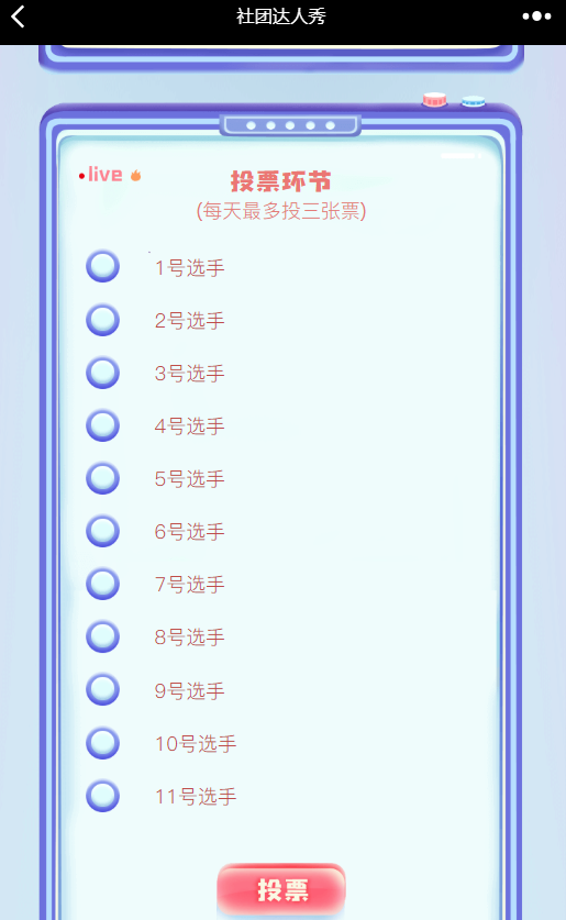 此项目为2019年社团达人秀的投票页面,运行于微信浏览器。于2019.11.28正式上线,总计上线时间为三天。