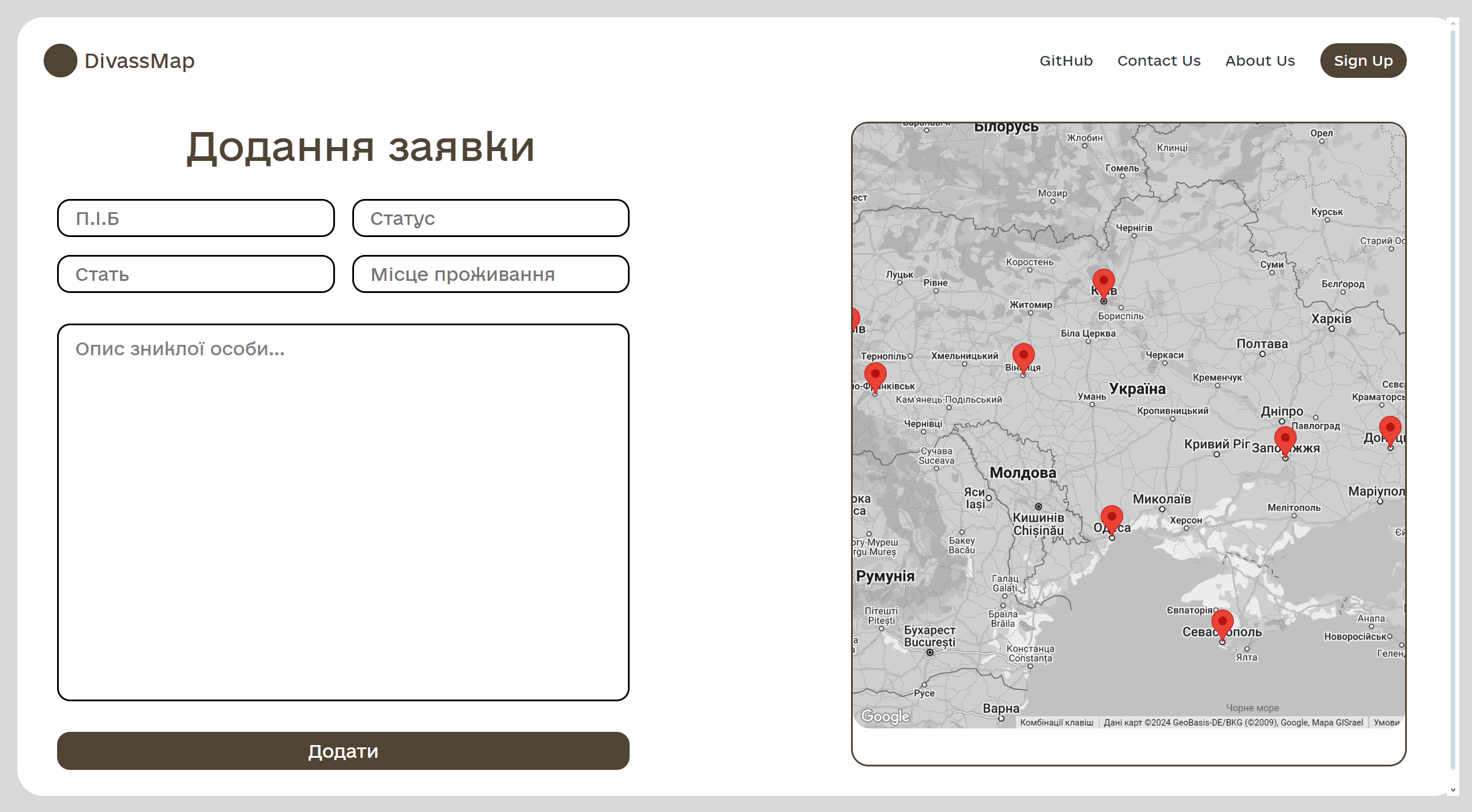 Hello everyone, we are The Divas team. We made this platform for coordinating the search for missing persons in the military conflict zone with our own efforts in 24 hours of painstaking work. The main idea was to make a one-page, non-scroll site that would simplify the search for missing soldiers and family members for volunteers and their families.