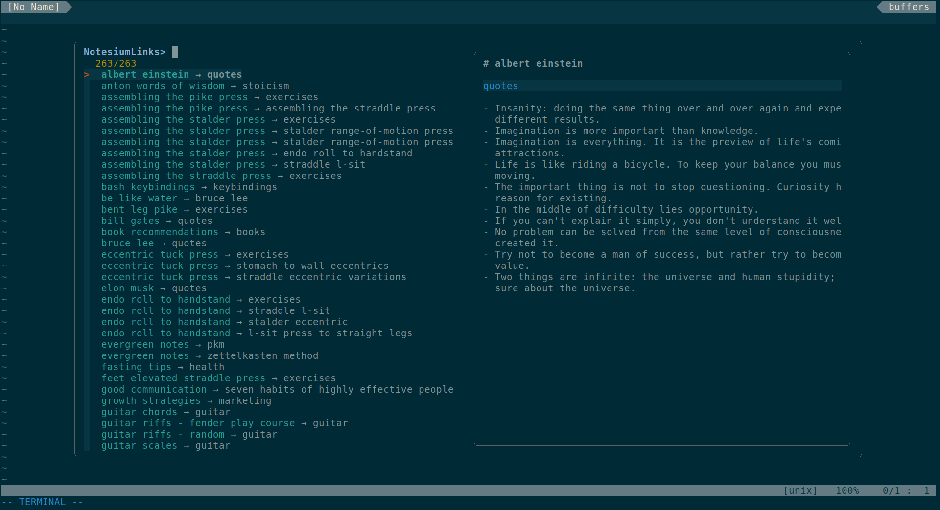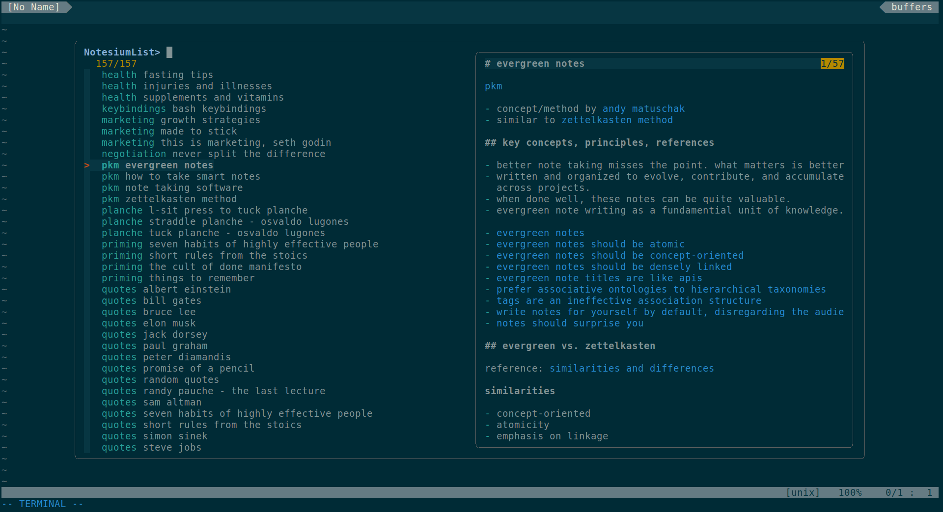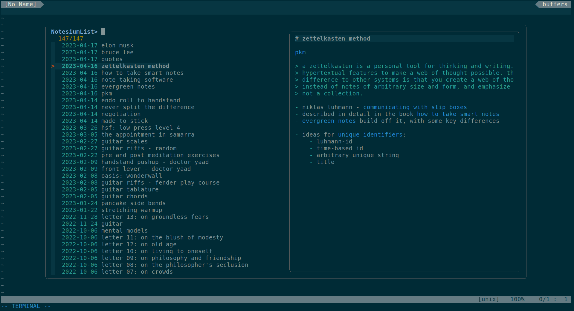xdg-open notesium:///home/user/notes/625d563f.mdFor Vim users, opening the listing is useful when integrated with a