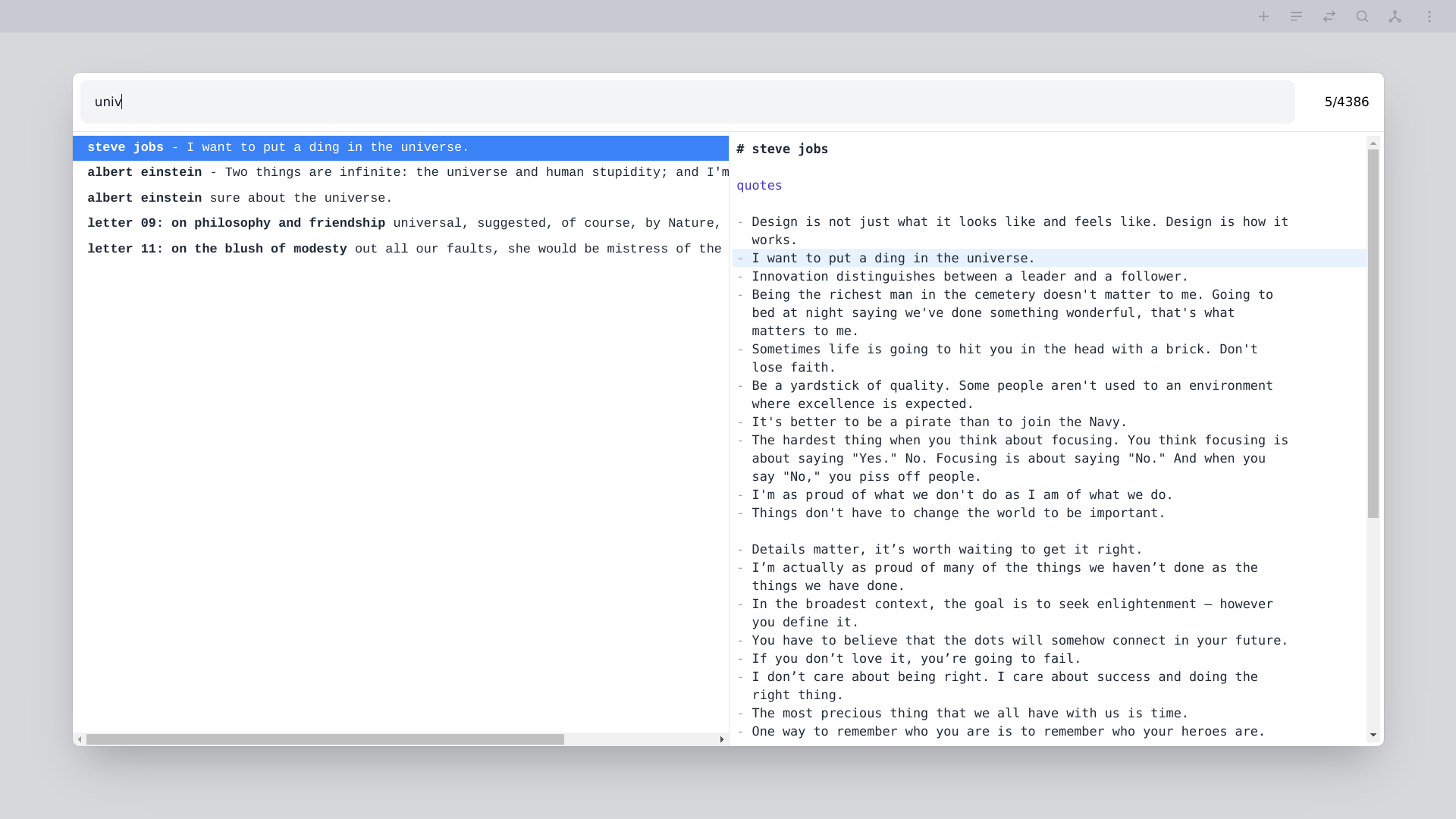 - Open multiple notes in tabs, drag to re-order, keybindings to switch.