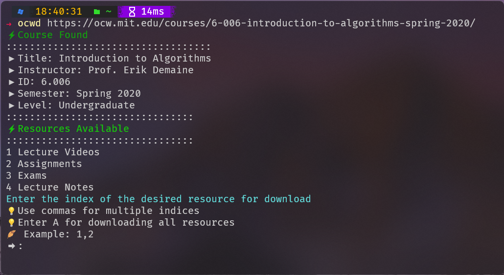 /bin/bash -c "$(sudo curl -fsSL https://raw.githubusercontent.com/amkhrjee/ocwd/main/ocwd.sh -o /usr/local/bin/ocwd && sudo chmod +x /usr/local/bin/ocwd)"This simply copies the ocwd.sh file to your /usr/local/bin/ directory. Now you can use ocwd from any directory in your system.