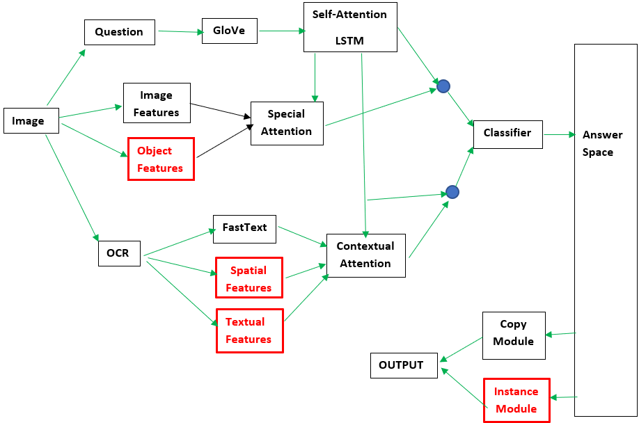 We have proposed few major improvements over Pythia, which is an implementation for the LoRRA model. The dynamic answering space is expanded by adding an Instance segmentation module. We have also replaced the existing OCR with spell correcting OCR and add the spatial features of the OCR. We have also implemented n-gram to the modified OCR.