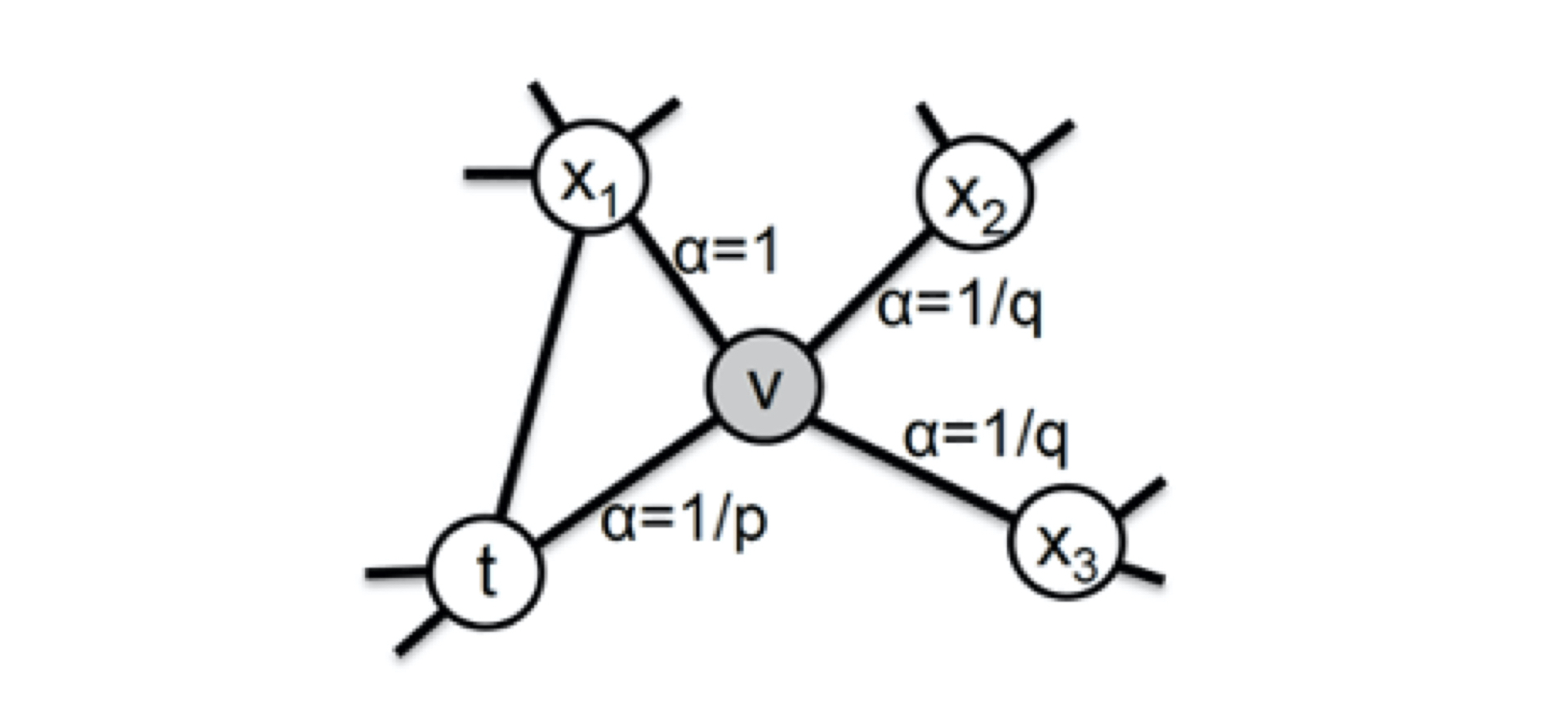 Node2Vec主要是通过节点间的跳转概率来控制跳转的倾向性。图 6 所示为 Node2vec 算法从节点