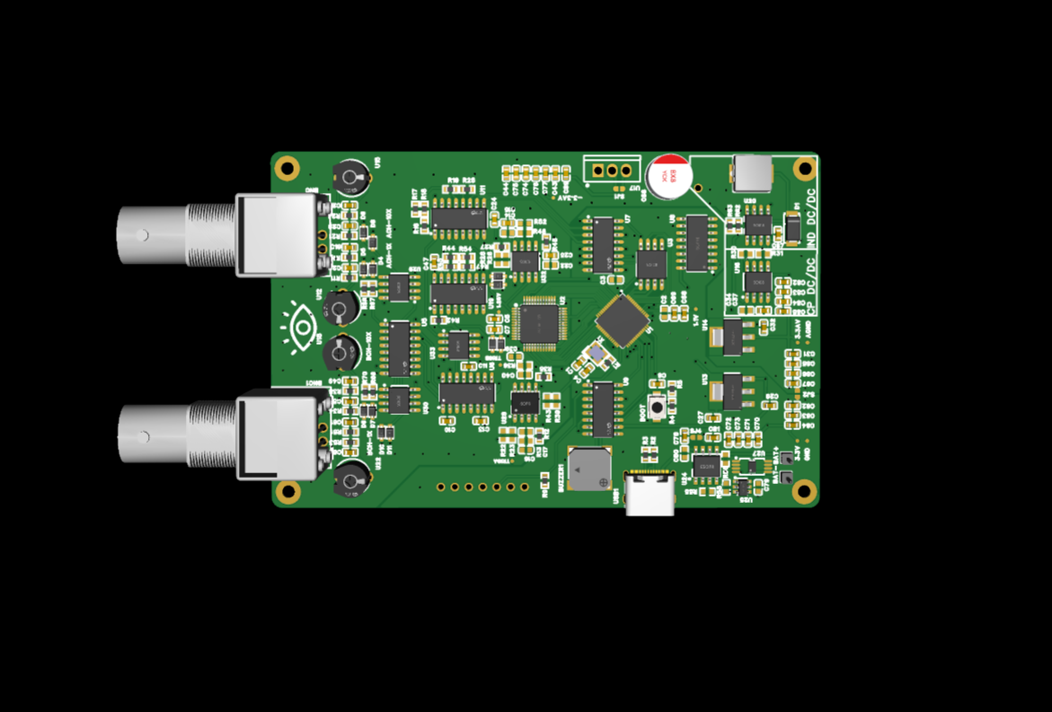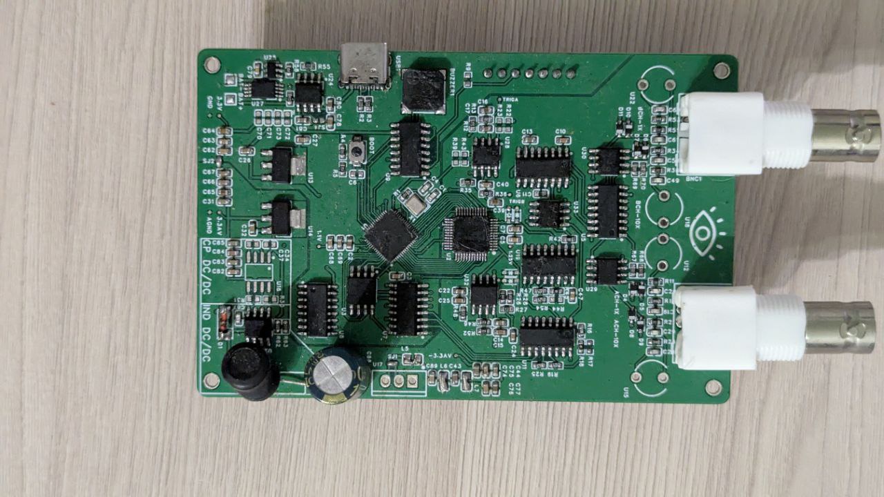 - Входной каскад: сигнал поступает через BNC-разъём, проходит через частотно-компенсированный аттенюатор с защитой от перенапряжения.