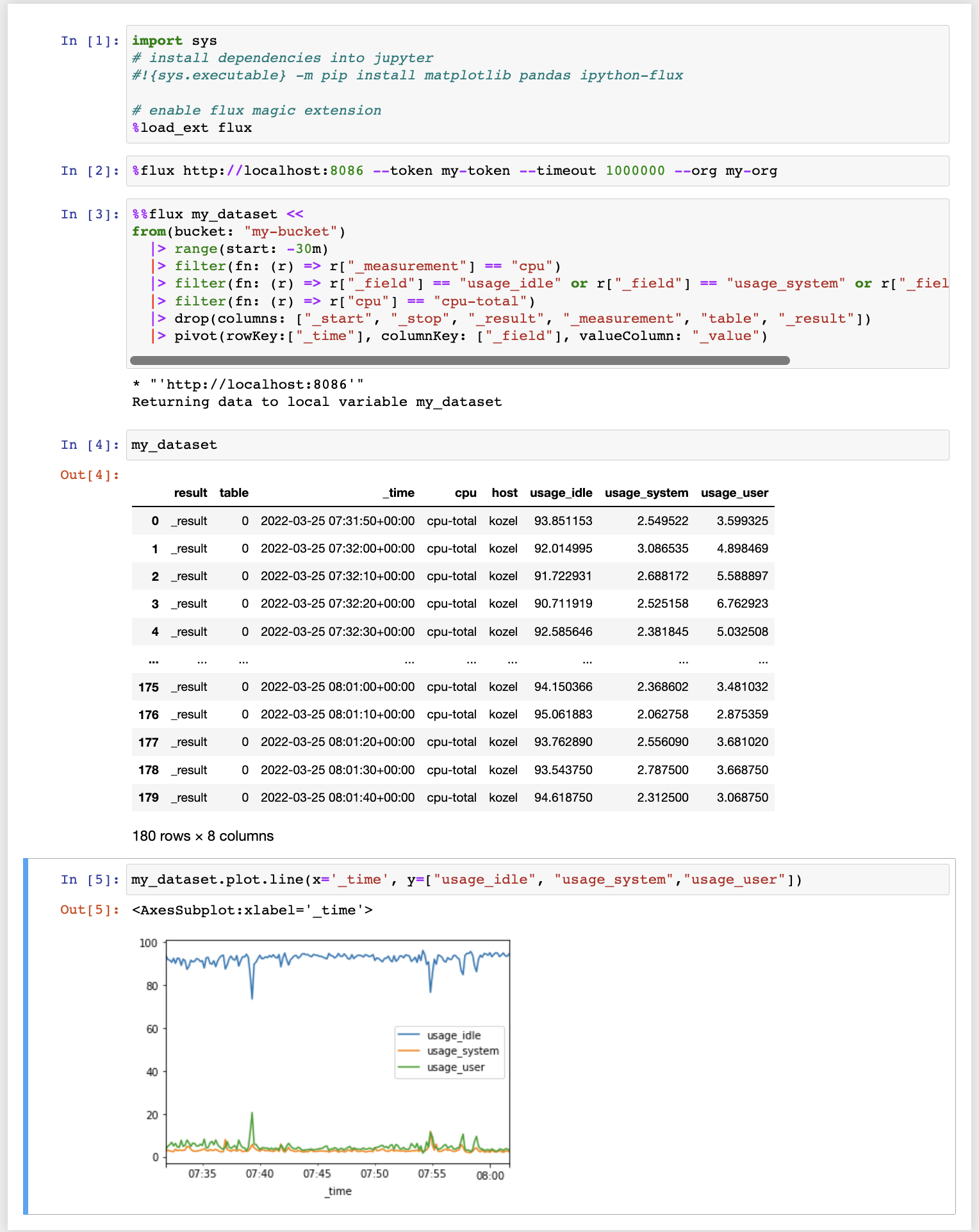 ...: |> pivot(rowKey:["_time"], columnKey: ["_field"], valueColumn: "_value")The result of the Flux command is automatically converted into Pandas dataframe. It is often useful to use Flux