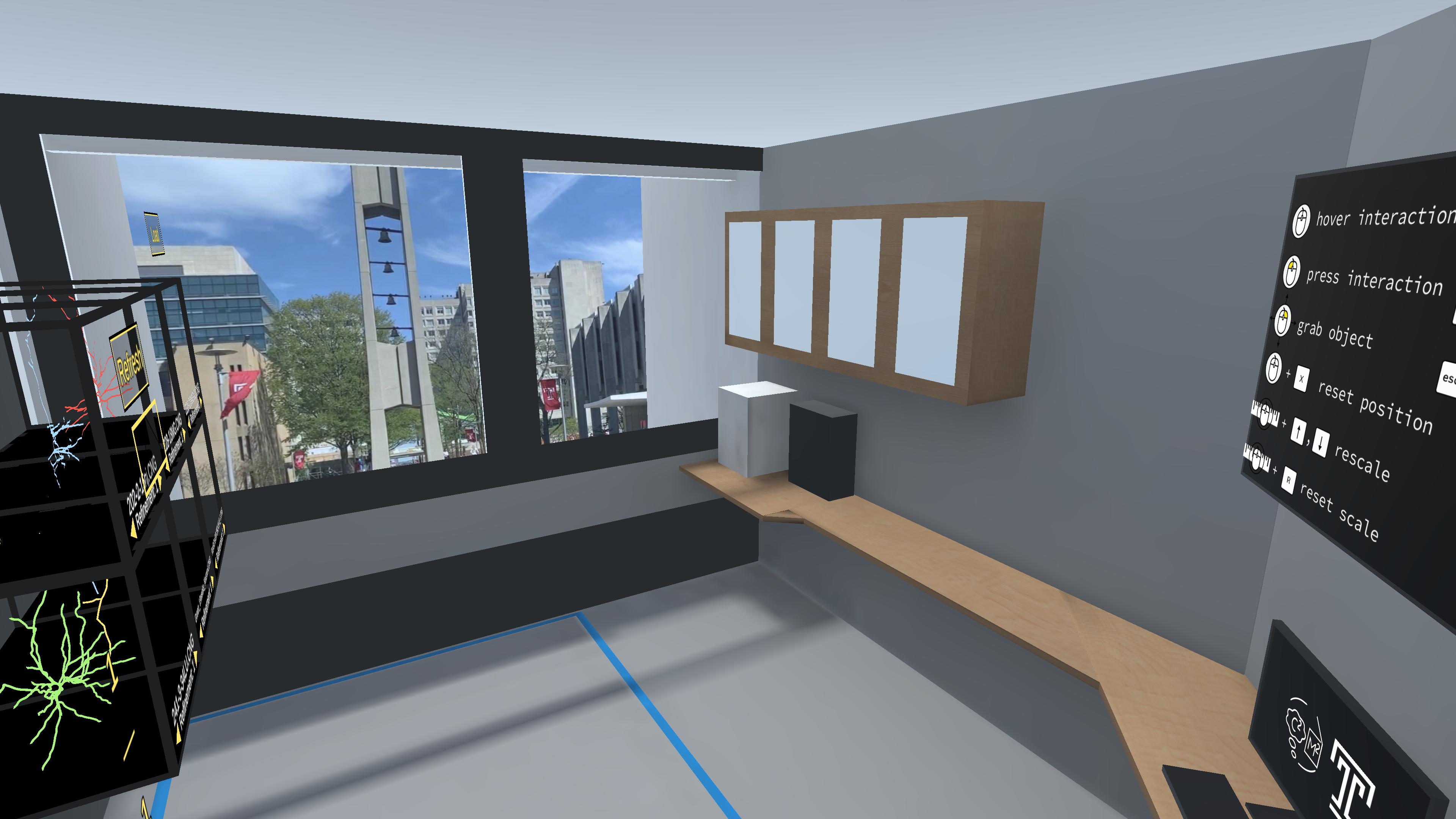 - Upon startup, the user is placed in a model of C2M2's lab. The application will detect a VR headset and launch in VR/keyboard emulator mode automatically.