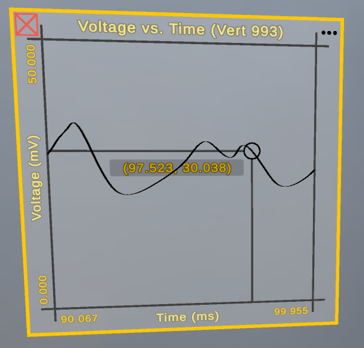 The user is able to spawn line graphs that are attached to specific 1D vertices on the neuron cell. These graphs will show the voltage at that 1D point over time.To spawn a graph panel, the user simply needs to toggle "Plot" on the board UI. At this point the user can raycast onto the surface of the mesh and press the index trigger (or click with the mouse) in order to spawn a graph attached to the nearest 1D vertex. Panels are grabbable and resizeable in the same way that the cell or the ruler is.