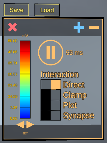 The board contains a subpanel for selecting the type of interaction. The user can select any of these toggles to change the effect of directly interacting with the surface. See direct, clamp, synapse and plot interactions for explanations of each.
