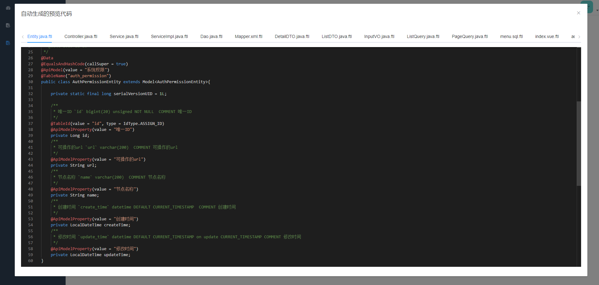 除此之外,提供了查看表字段信息和生成的代码预览功能,下图为选中表字段信息展示