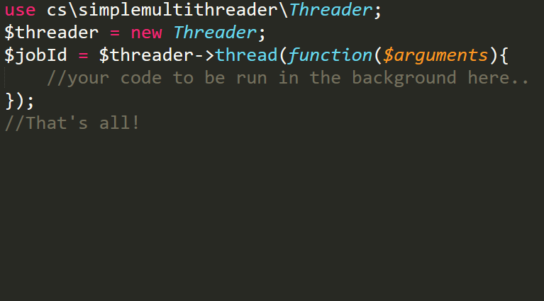 $jobId = $threader->thread(function($arguments){ //bootstrap code here.. //your actual code here.. }); -