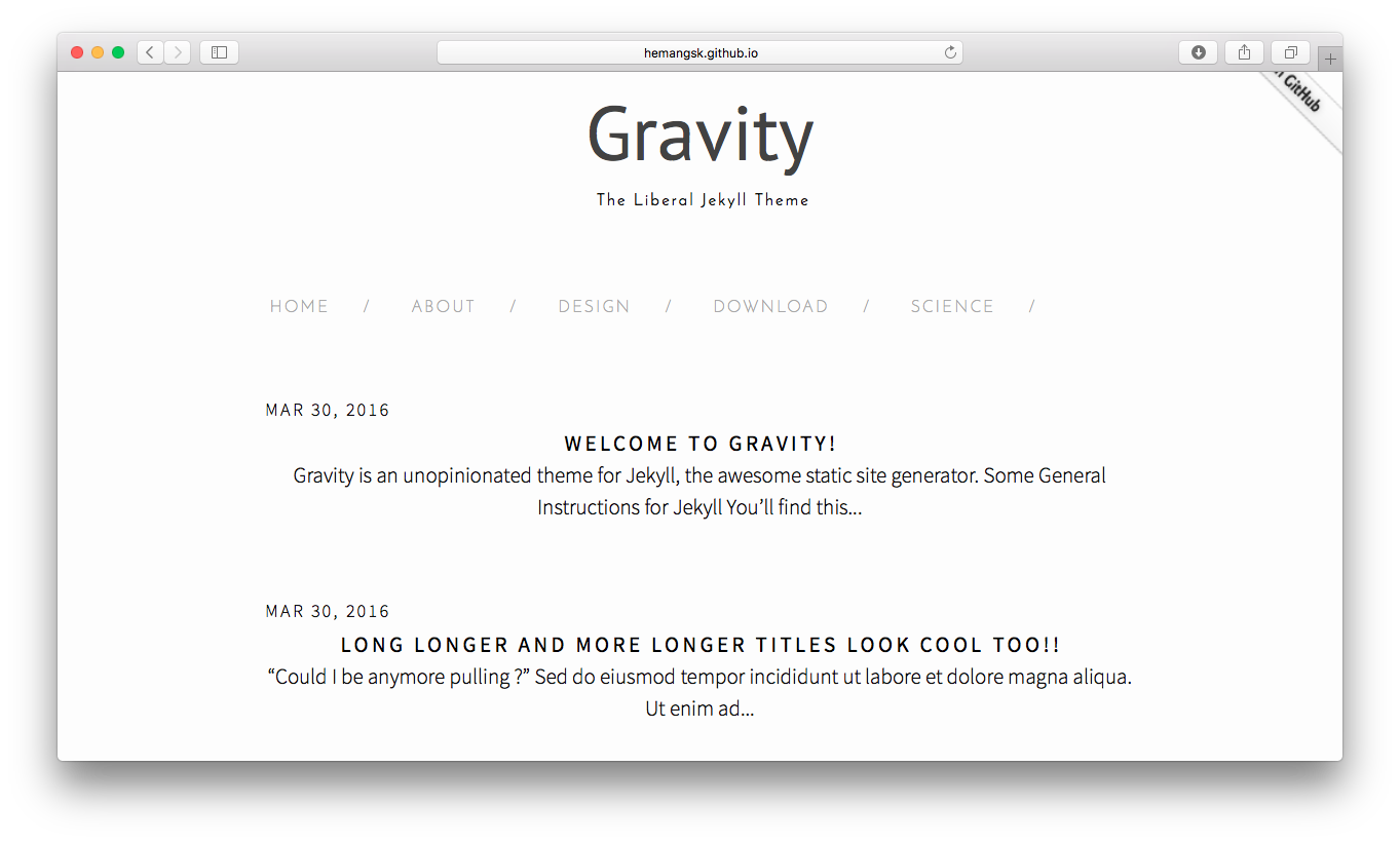 $ gem install jekyll-paginateOnce you have the required gems, you can go ahead and clone the Gravity repository or download a zip of the master branch.