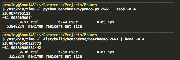 This is a trivial program, but shows that performance is comparable to Pandas, and the memory savings of a compiled program are substantial.