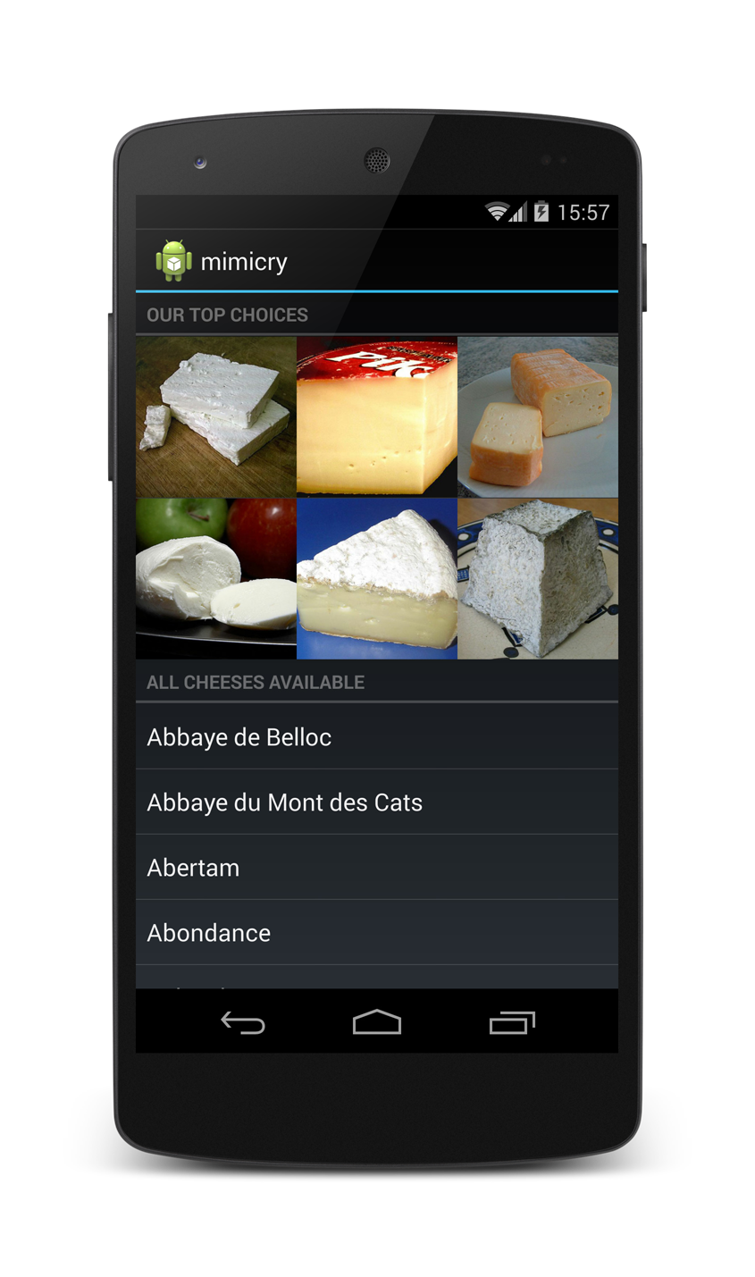 listView.setAdapter(mimicryAdapter);Since every row represented by the MimicryAdapter actually contains multiple items, the normal OnItemClickListener you use with a ListView is not sufficient. Instead, attach a OnMimicryItemClickedListener to catch item click events.