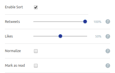 100% retweetand0% likemeans sorting would consider retweet count only. - You can choose to normalize the count of retweets & likes by the tweet's age (e.g. to see what's hot)