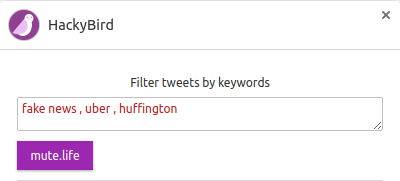 - You can enter comma separated keywords. Any tweet containing these keywords would be hidden when you click the hackybird icon.
