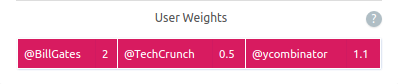 Q : What is "user weight" ? A : Higher weight => tweets & retweets from the user would be shown higher up. Default is 1. Any other value is multiplied to the count of retweets & likes. So a user weight of 1.5 with 100 retweets & 20 likes has a score = 1.5 x (100 + 20)