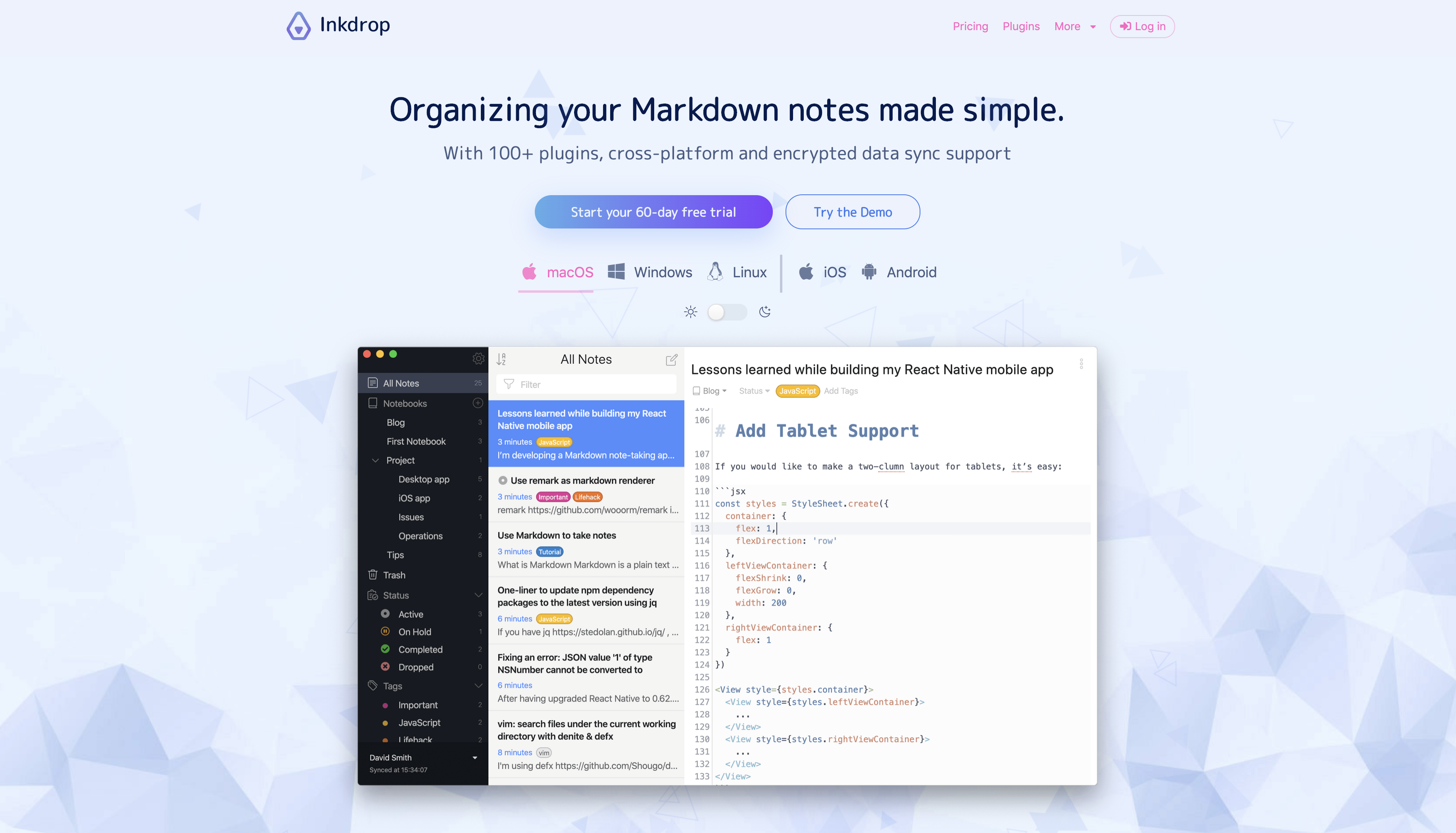 Inkdrop Website https://www.inkdrop.app/ Stack GatsbyJS Semantic UI Streamline Icons PurgeCSS Netlify etc. Directory src ├── components ├── data ├── images │ ├── icons │ └── testimonials ├── pages ├── semantic │ └── site │ ├── collections │ ├── elements │ ├── globals │ ├── modules │ └── views └── utils LICENSE MIT