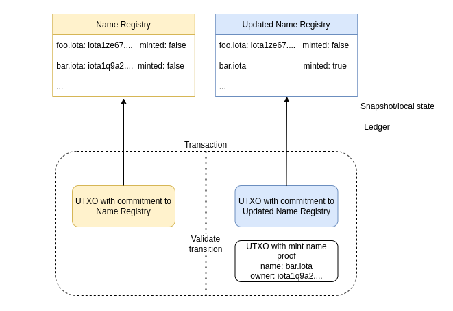 The name registry has to be kept off-chain, but a commitment to its current state has to be stored in an output.