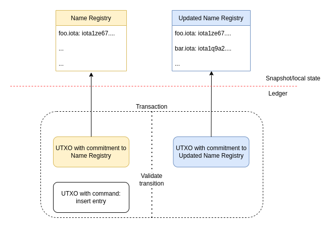 When the network processes this transaction, it applies the command in the white UTXO to the off-chain stored name registry (yellow), and checks whether the commitment of the updated name registry in the blue UTXO is valid. If not, the transaction is deemed invalid.