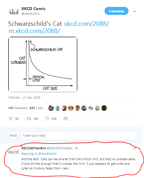 This Twitter bot replies to tweets from @xkcdComic with the alt text of the most recent XKCD comic.