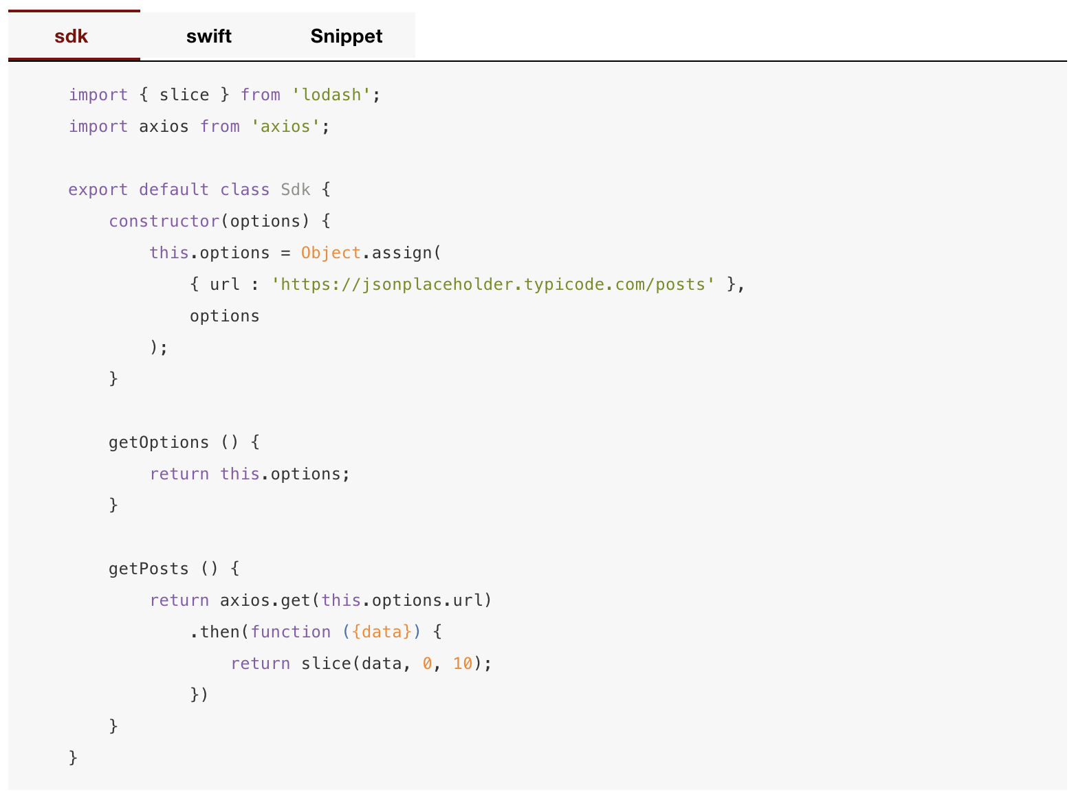 The example above shows a code block js::sdk, where js is the language syntax to be used and sdk denotes the name to be seen in the tab; :: (configurable) is used to separate both terms.
