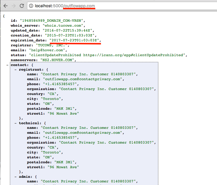 Microservice used by Outflow. It was created with the intention of finding the expiration date on a user's domain name as a convenience when adding a subscription. It gathers the WHOIS data for a domain and returns it in JSON. To get the WHOIS information for a domain, you would do `/[Domain-name].