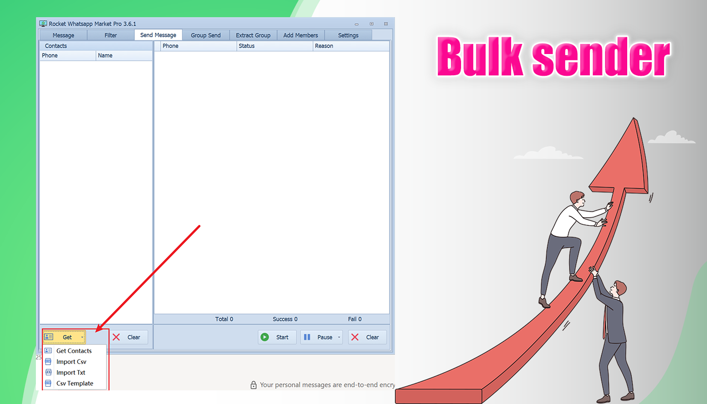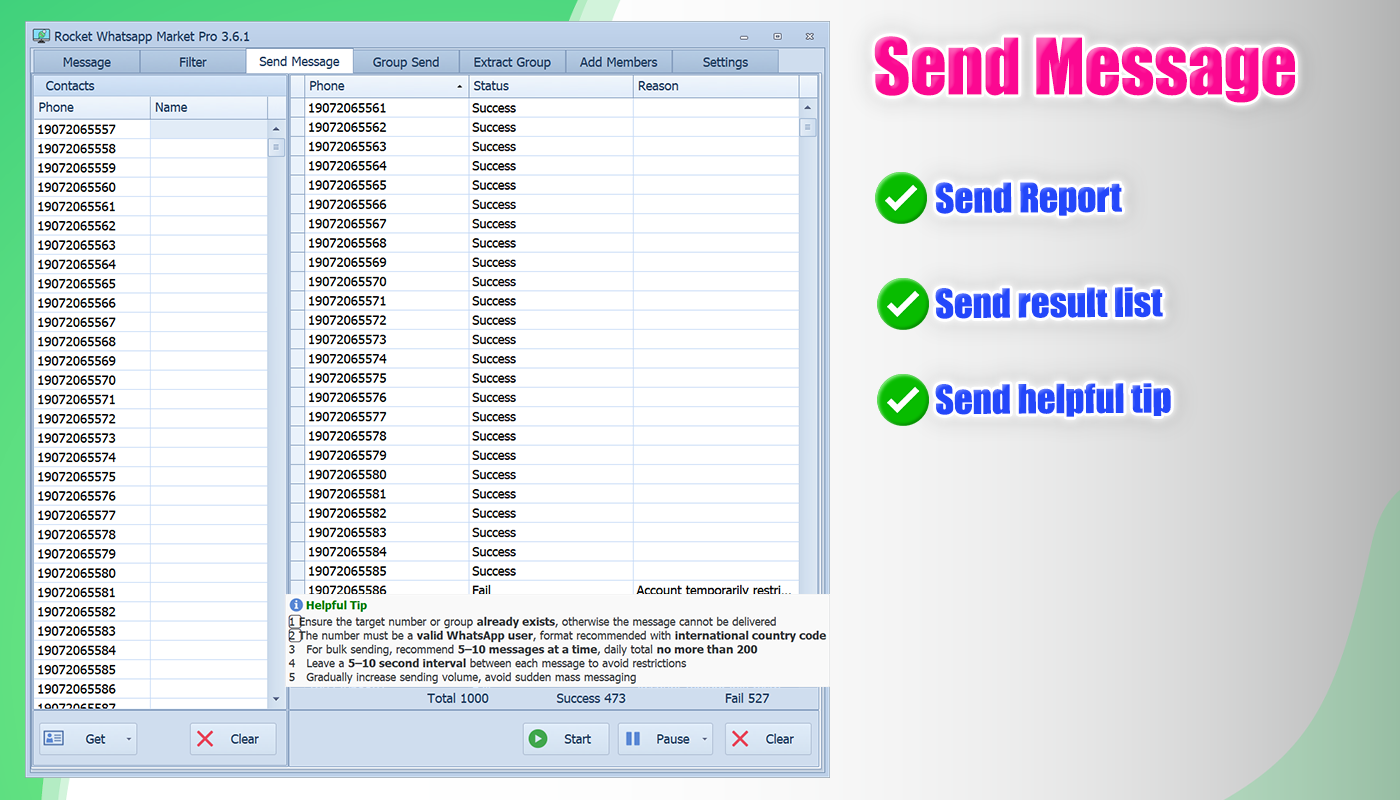 - Group Selection: Choose from your joined groups and send messages in bulk.