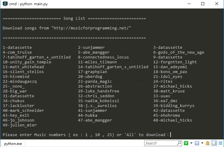 輸入要下載的歌曲號碼後按下 Enter 鍵,不同號碼間請用 "," 分隔,或輸入 "All" 來下載全部歌曲。