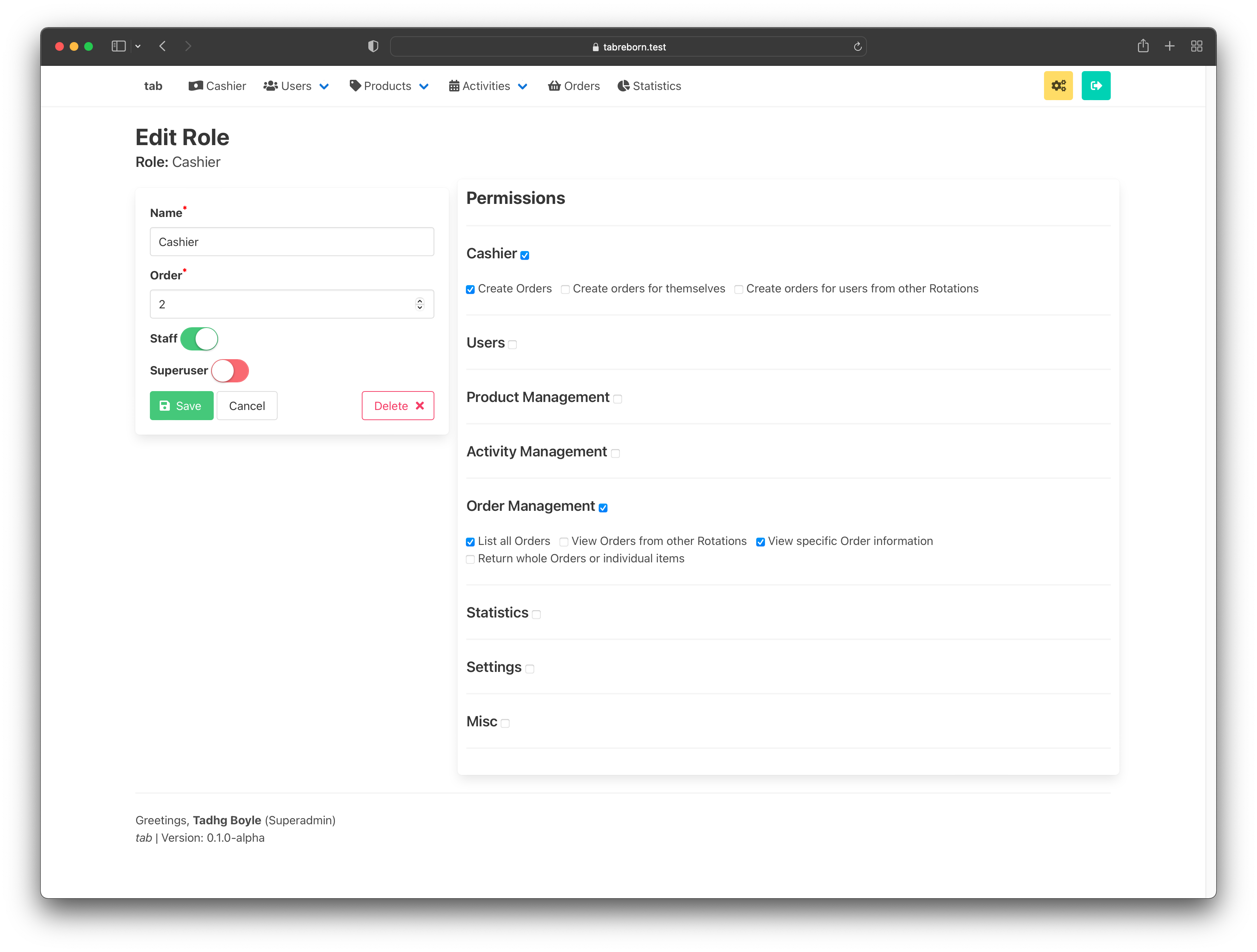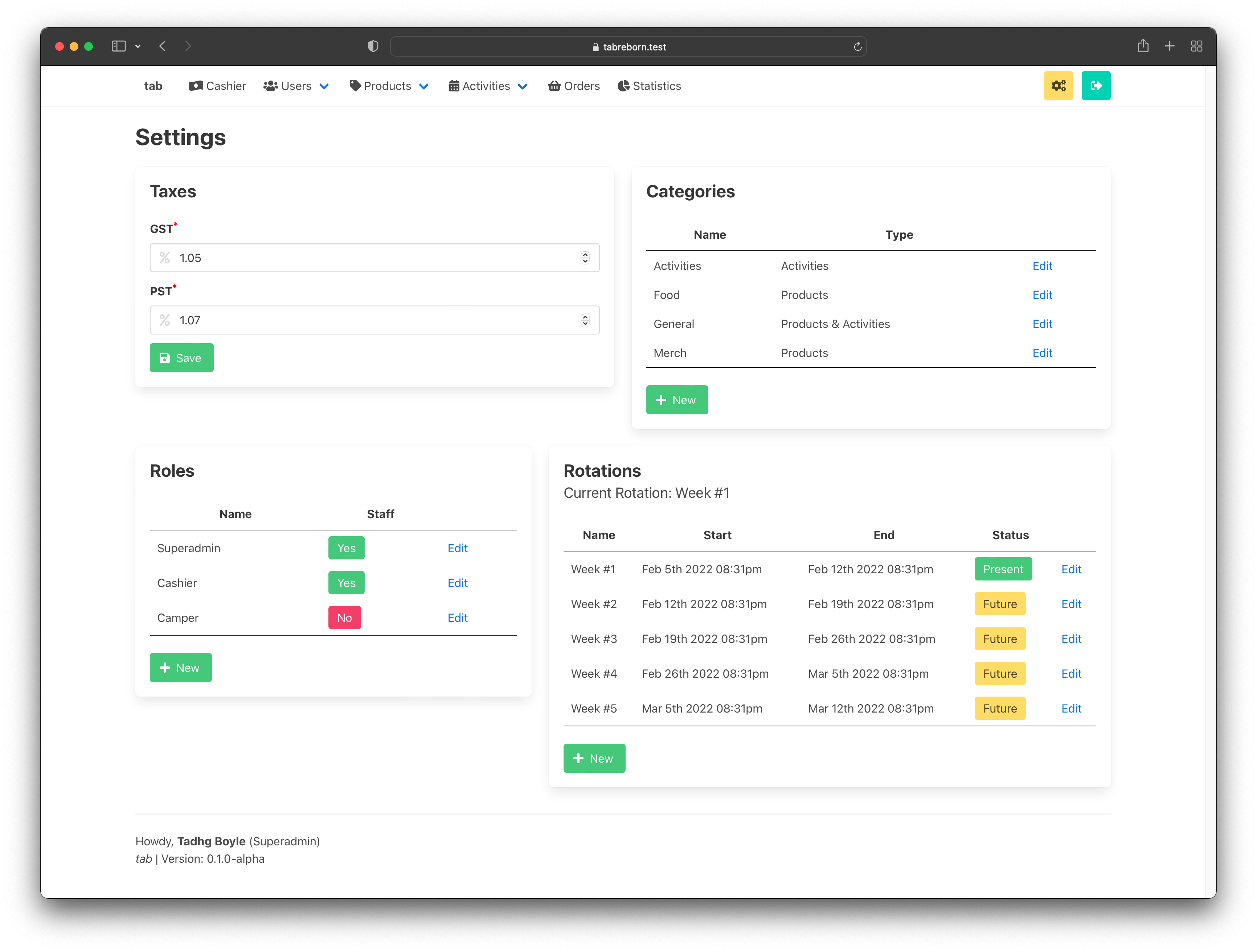 users_list: This role can view the user list.users_manage: This role can edit/create users (but only edit users which have a role lower than theirs in terms of hierarchy).products_ledger: This role can adjust product stock, but they will needproducts_listandproducts_managein order to list or create products.settings_categories_manage: This role can create/edit product categories in the Settings page.- And many more! I try to add as much customizability as possible for permissions.