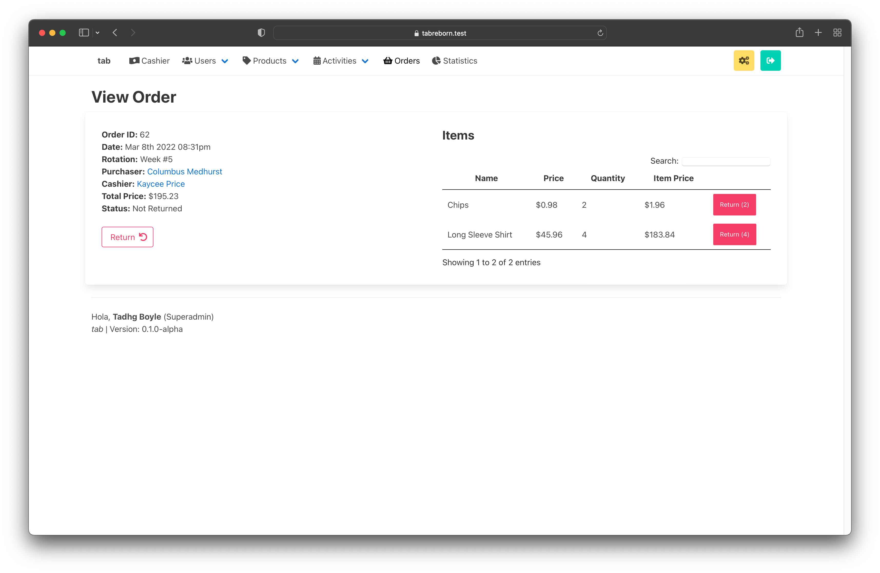 - Return an individual item from an order. A counter shows how many are left to be returned. Multiple backend checks to verify validity of return.