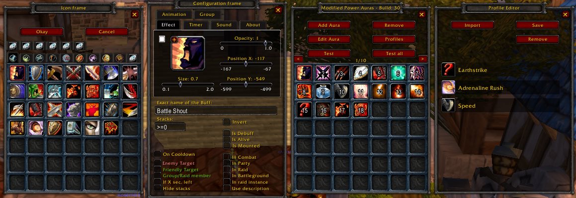 Modified Power Auras is the advanced version of the AddOn Power Auras. It is a lot more powerful and provides every possible function that could be backported from cataclysm. Plus it provides some custom features that are very helpful.