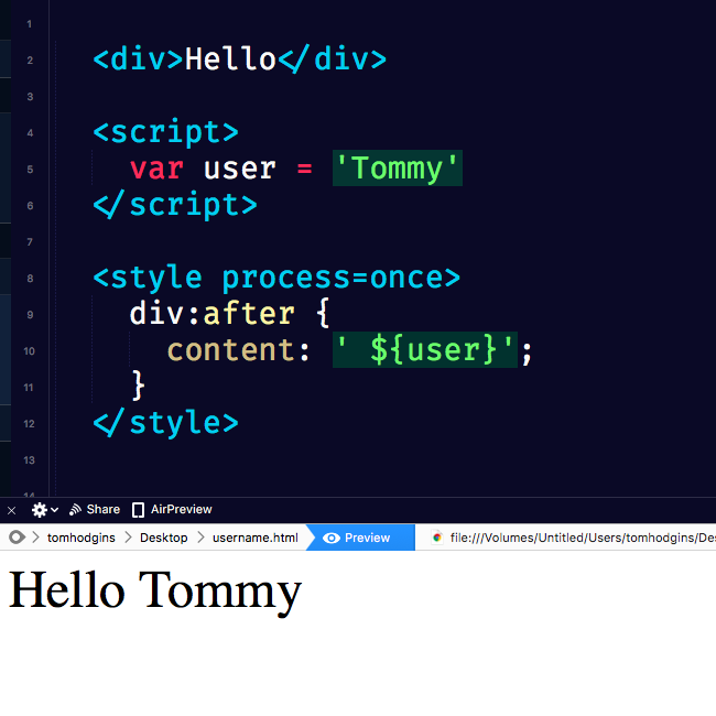 const reprocss = require('reprocss')To evaluate JavaScript inside the CSS as it's being reprocessed by reprocss.js you can use the ${} interpolation syntax. The following <style> tag would always ensure the <div> in this example was half of the window's height: