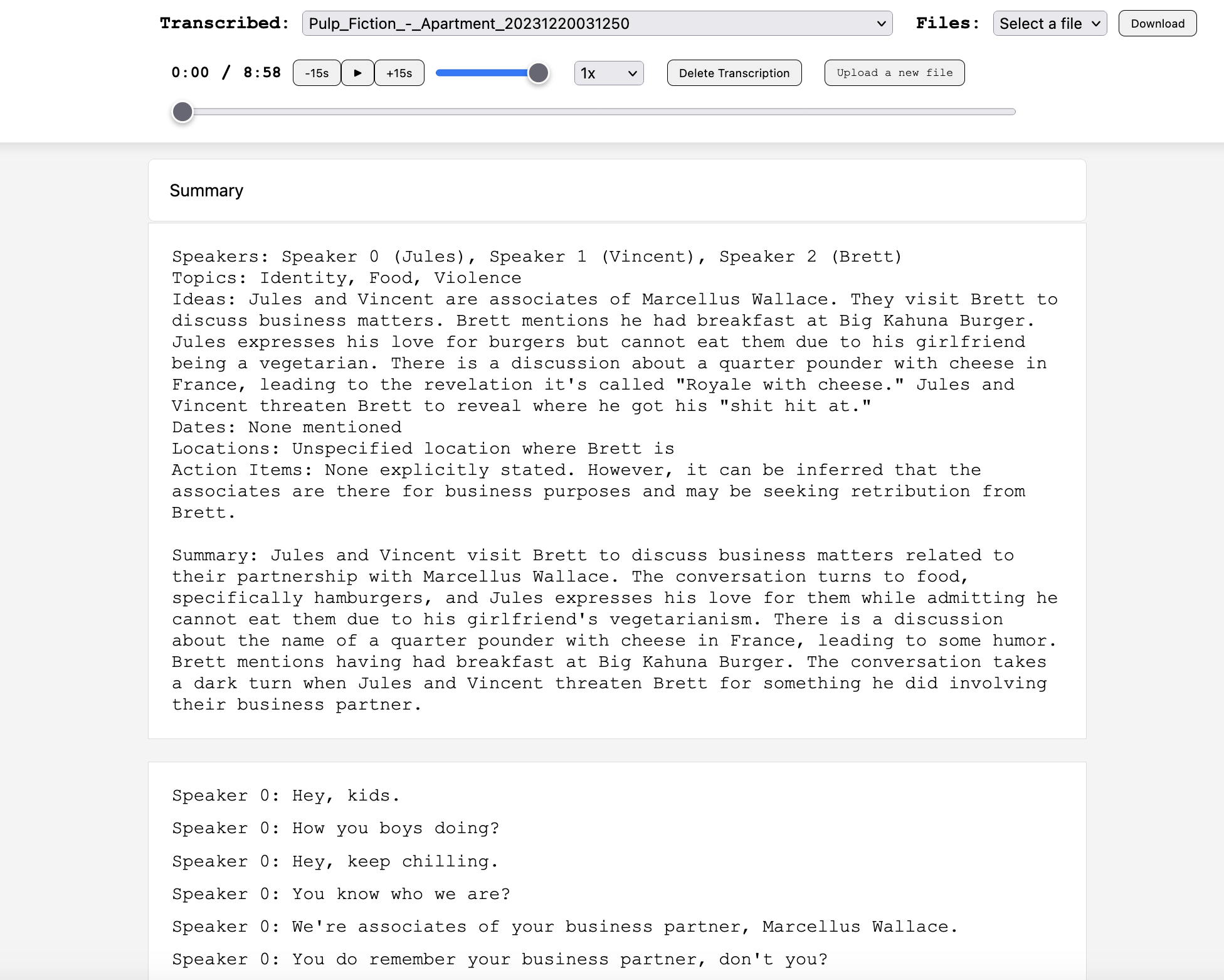 A web interface and SSH drop zones make this simple to use and implement into your workflows. Ollama allows for a powerful toolset, limited only by your prompt skills, to perform complex operations on your transcriptions. Meiliesearch adds ridiculously fast full text search.