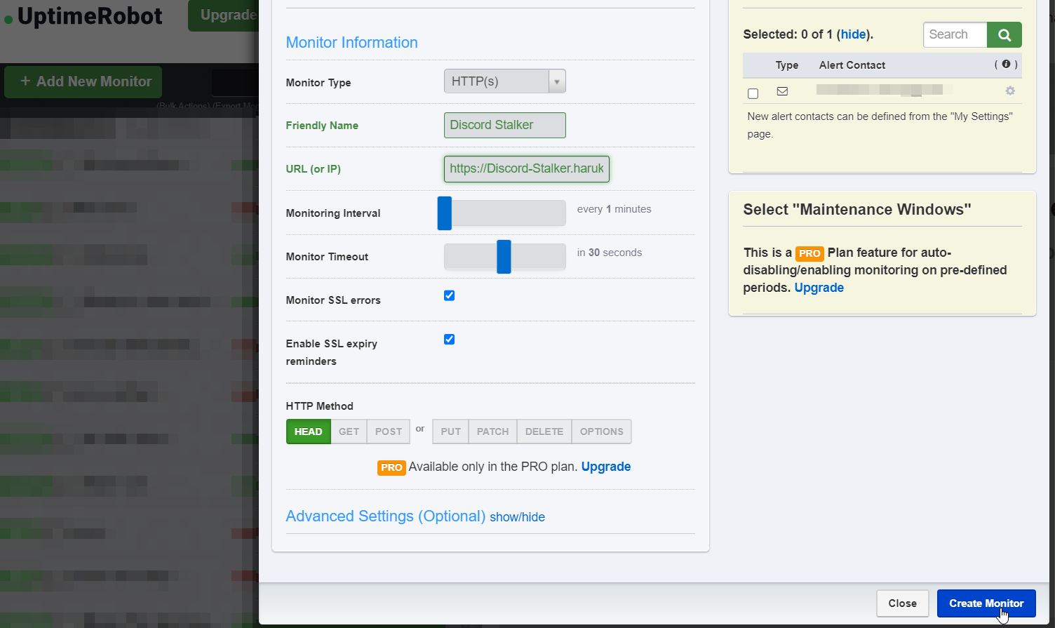 HTTP(s)> Give it a name > Enter the url in theURL (or IP)> Set monitoring interval to 1 minute > Click create monitor