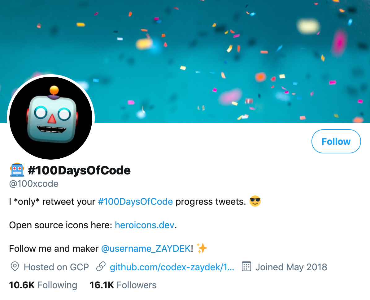 #100DaysOfCode Twitter Bot 🤖 @100xcode *only* retweets your #100DaysOfCode progress tweets! 😎 License Open source software licensed as MIT. Follow me on Twitter @username_ZAYDEK! 🖖